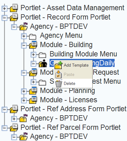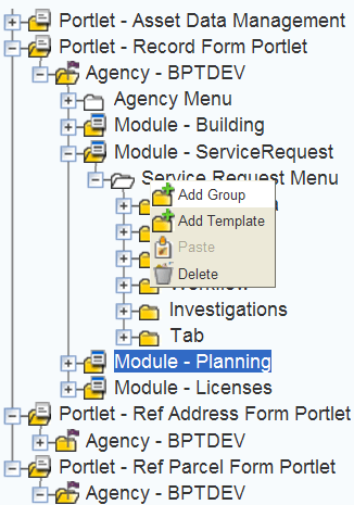 2. Open the portlet and module folders where you want to add a template menu to a group.