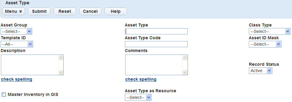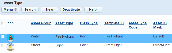 Use the following procedure to search for an asset type. If you do not have the full name of the asset type, you can use partial text. For example, to find a water line asset type, enter “water” into the Asset Type field. The search returns all asset types that start with “water.”