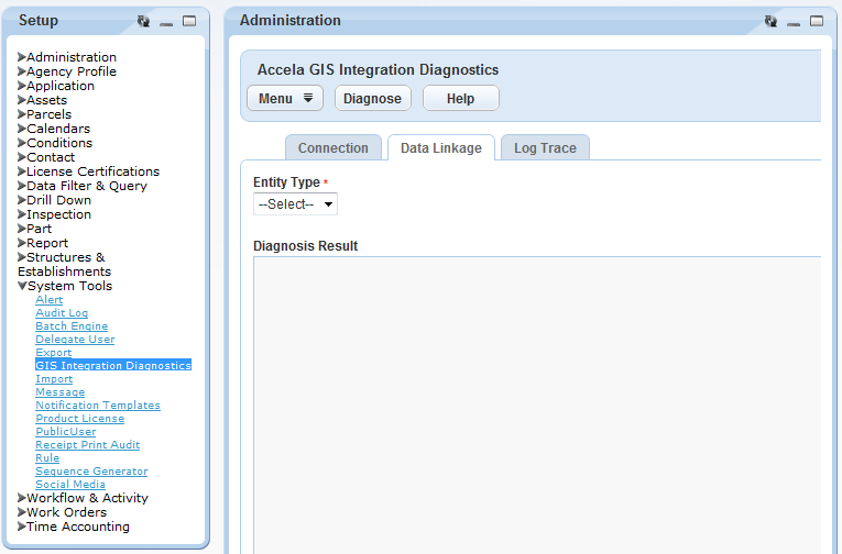 The Data Linkage diagnostic tool applies to legacy Accela GIS and examines whether there are any issues in the association between assets and GIS objects, between parcels and GIS objects, or between records and GIS objects. This diagnostic tool also offers solutions for you to troubleshoot any issues.