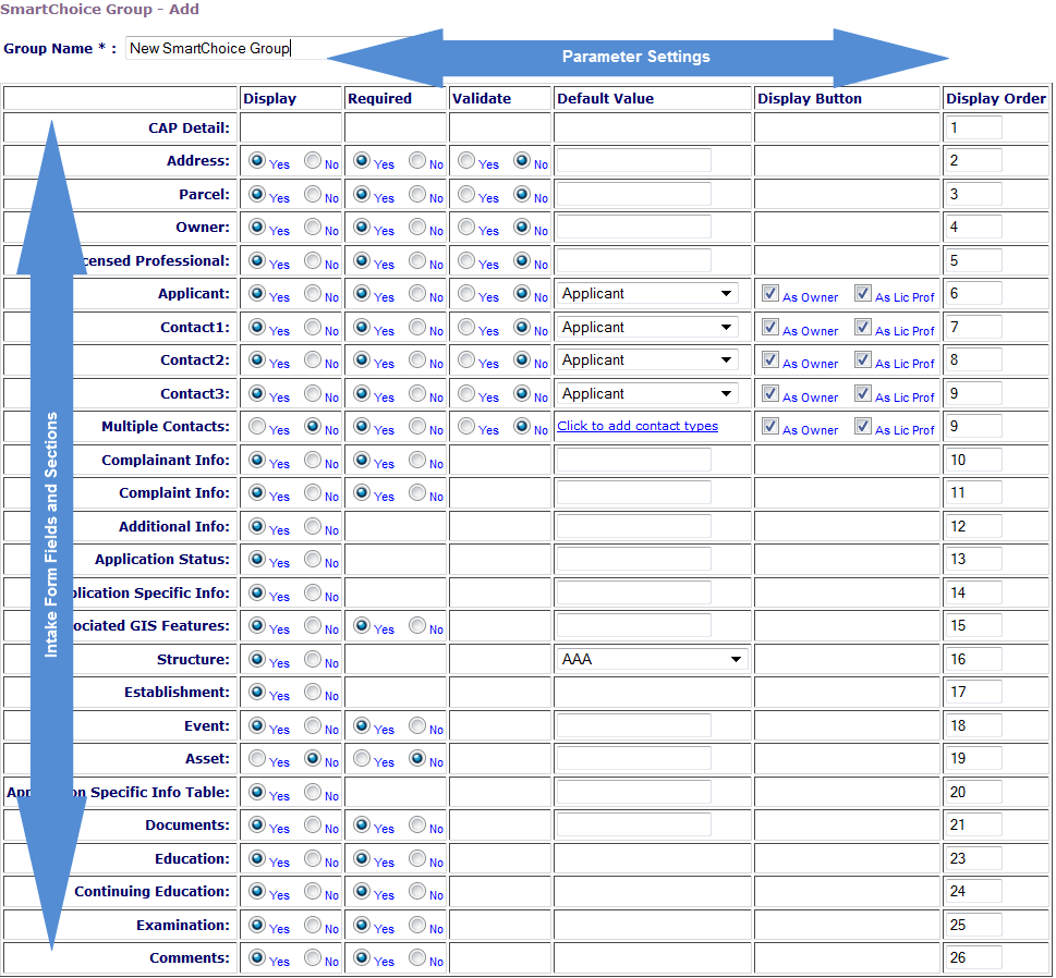 If you click Yes at the Validate and Required options of the Applicant or Contact section, all the other sections and the fields in the intake form are inactive until users validate the section. If a contact list requires validation, you only need to validate the primary contact in the list. Click No to disable validation. If a section does not require validation, users can enter new information or modify the information that they select from the reference database.