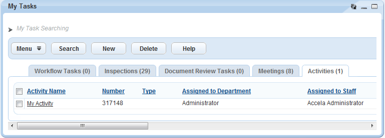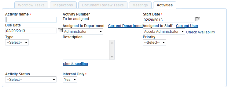 Activities refer to a past action or past event related to a record. You can assign activities to a staff member when the activities require further action, such as a follow-up inspection or a phone-call.