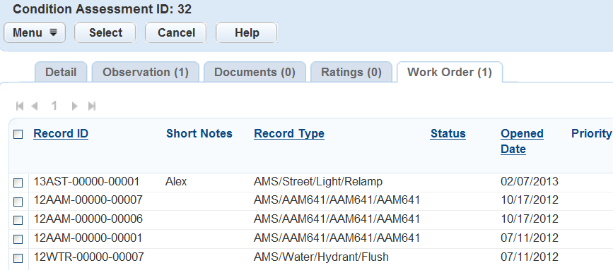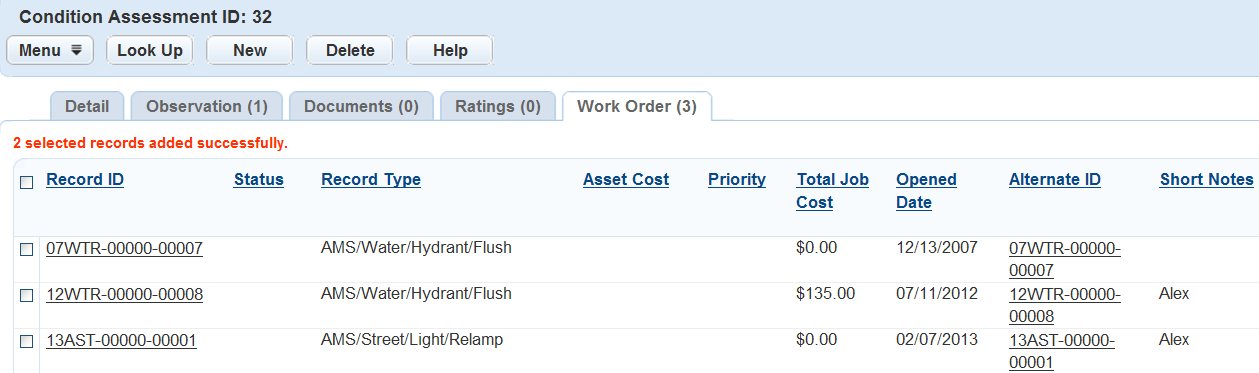 Civic Platform creates the work order and then returns to the Asset Condition Assessment Work Order list portlet.