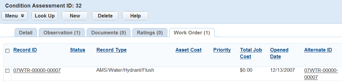 2. Click the Condition Assessment ID link for the assessment to which you want to link a work order.