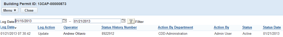 Civic Platform displays the Status History log for the selected record.